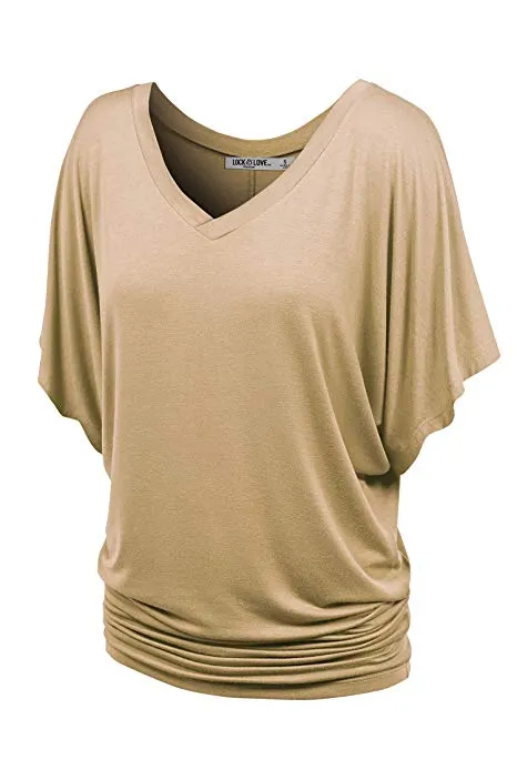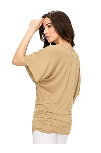 Lock and Love Women's Solid Short Sleeve Boat Crew Neck V Neck Dolman Top XS - 5XL Plus Size Made in USA