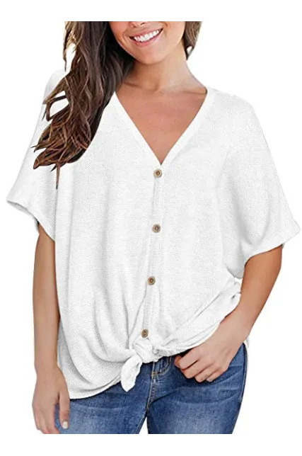 MIHOLL Womens Loose Blouse Short Sleeve V Neck Button Down T Shirts Tie Front Knot Casual Tops