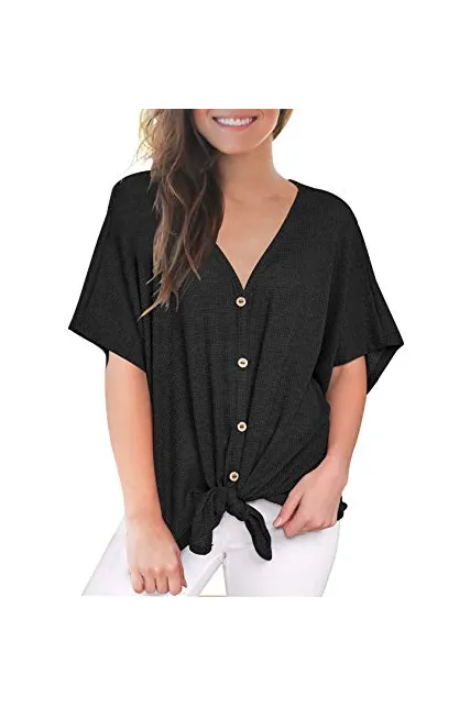 MIHOLL Womens Loose Blouse Short Sleeve V Neck Button Down T Shirts Tie Front Knot Casual Tops
