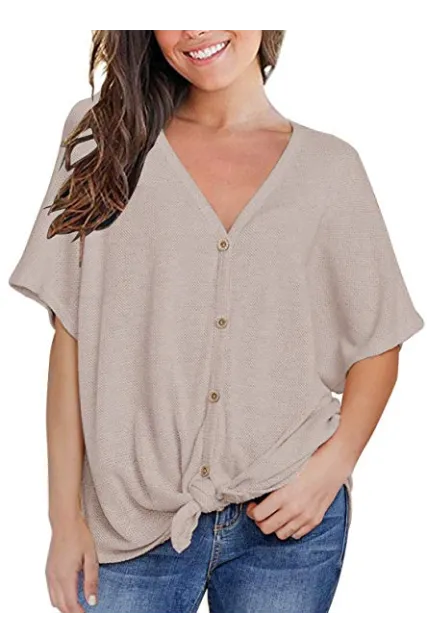 MIHOLL Womens Loose Blouse Short Sleeve V Neck Button Down T Shirts Tie Front Knot Casual Tops