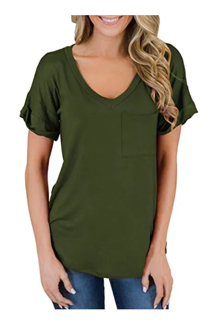 - Sexy V Neck tees, Short sleeve T-shirt, Plain, roll sleeve, Basic tees with front pocket decoration, So cute tops