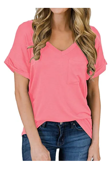 - Sexy V Neck tees, Short sleeve T-shirt, Plain, roll sleeve, Basic tees with front pocket decoration, So cute tops