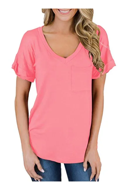 - Sexy V Neck tees, Short sleeve T-shirt, Plain, roll sleeve, Basic tees with front pocket decoration, So cute tops