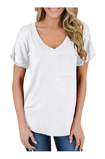 - Sexy V Neck tees, Short sleeve T-shirt, Plain, roll sleeve, Basic tees with front pocket decoration, So cute tops