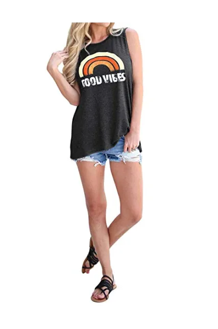Nlife Women Good Vibes Tank Blouse Round Neck Sleeveless and Long Sleeve Rainbow Casual Ladies Waistcoat Tank Tops for Women