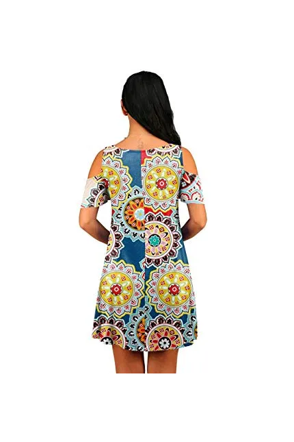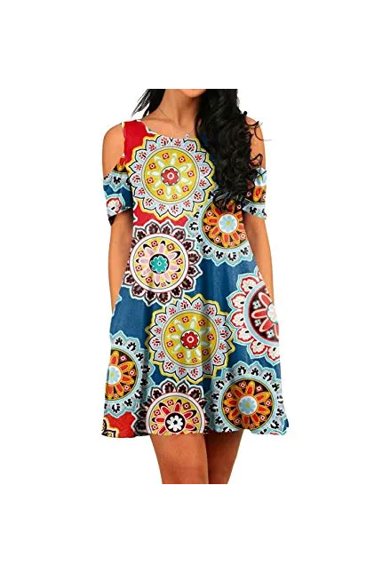 - Feature: Round neck, Short Sleeve, Swing hem, tank top dress,Loose fit, tunic top dress, long Tshirt, swing dress, casual wear,Round Neck Cold Shoulder Ruffle Sleeve A-Line Dress