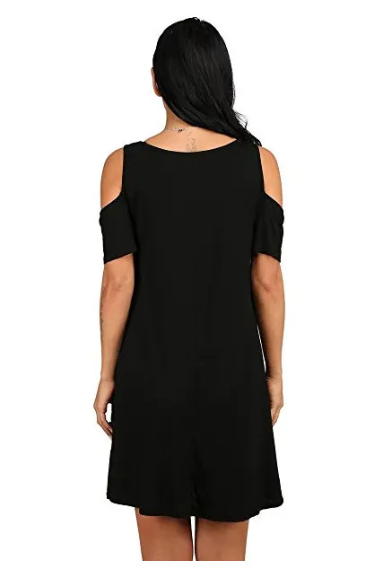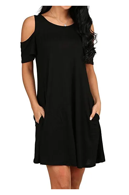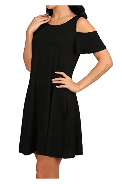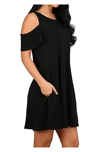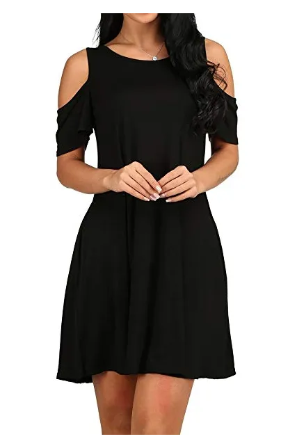 - Feature: Round neck, Short Sleeve, Swing hem, tank top dress,Loose fit, tunic top dress, long Tshirt, swing dress, casual wear,Round Neck Cold Shoulder Ruffle Sleeve A-Line Dress