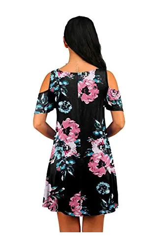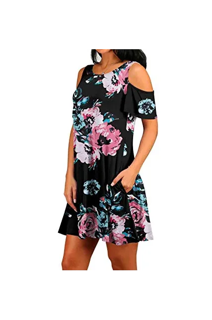 - Feature: Round neck, Short Sleeve, Swing hem, tank top dress,Loose fit, tunic top dress, long Tshirt, swing dress, casual wear,Round Neck Cold Shoulder Ruffle Sleeve A-Line Dress