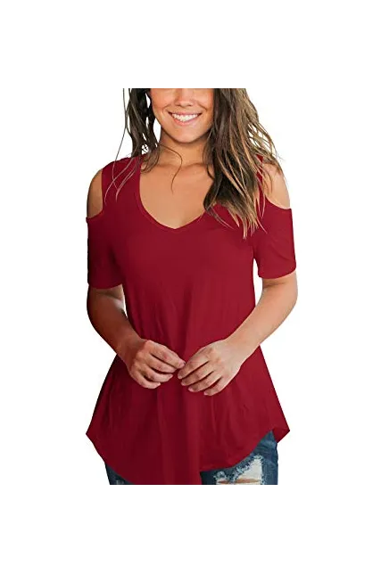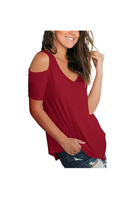 SLIMMING GRIL Women's Casual T Shirt V Neck Cold Shoulder Tops Short Sleeve Tshirt