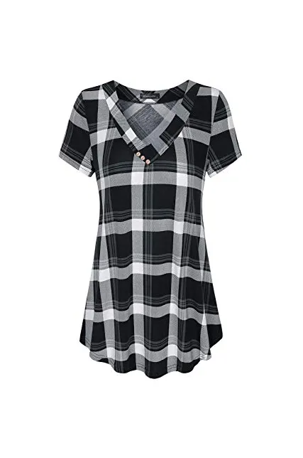 - Flare style/Hits at hip/Flowy tunic/Short sleeve/V neckline with vintage button embellished