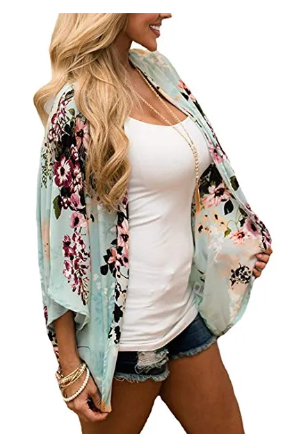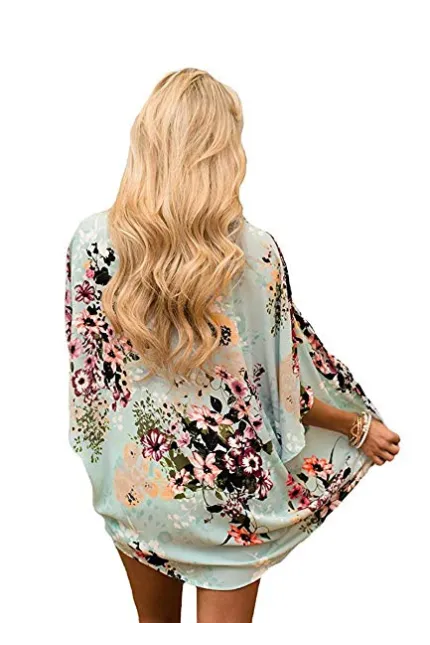 - Womens Floral Print Loose Puff Sleeve Kimono Cardigan Lace Patchwork Cover up Blouse