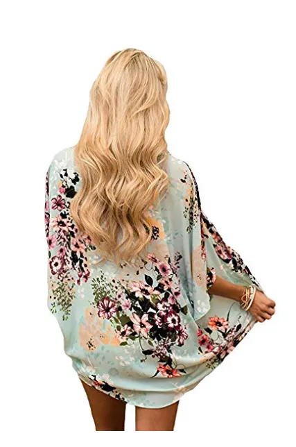 Women's Floral Print Puff Sleeve Kimono Cardigan Loose Cover Up Casual Blouse Tops