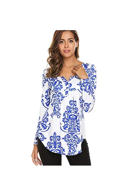 - Loose fit tunic Features Paisley Bohemia pattern design / Floral print pattern / Long sleeve / V neck /Button up / Pleated front/Flowy bottom hem