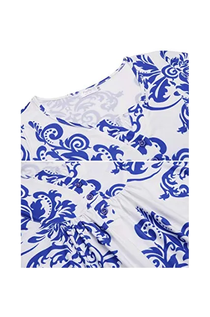 Women's Paisley Printed Long Sleeve Henley V Neck Pleated Casual Flare Tunic Blouse Shirt