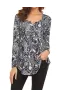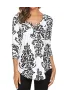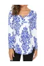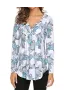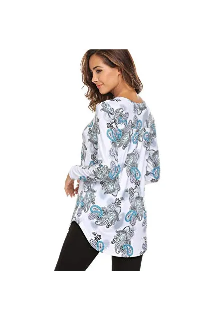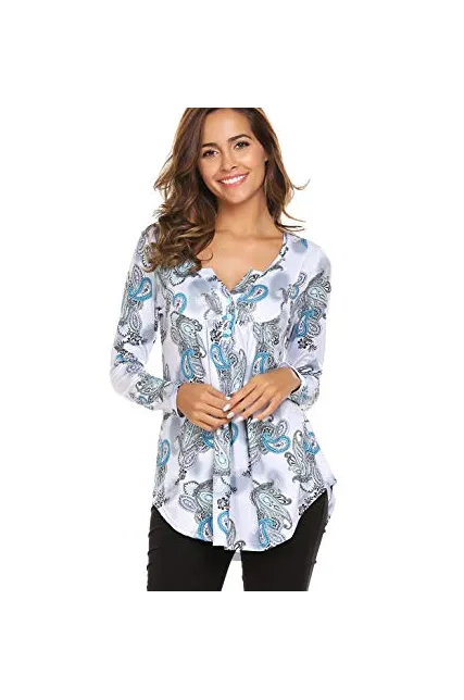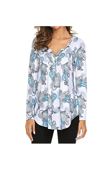 Women's Paisley Printed Long Sleeve Henley V Neck Pleated Casual Flare Tunic Blouse Shirt