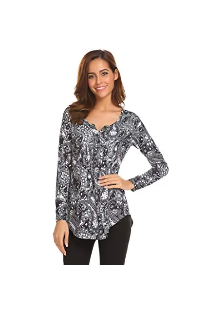 Women's Paisley Printed Long Sleeve Henley V Neck Pleated Casual Flare Tunic Blouse Shirt