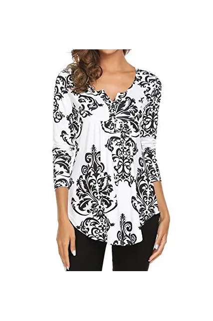 Women's Paisley Printed Long Sleeve Henley V Neck Pleated Casual Flare Tunic Blouse Shirt