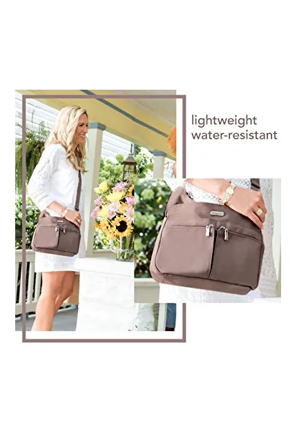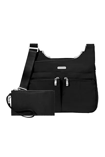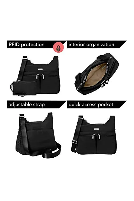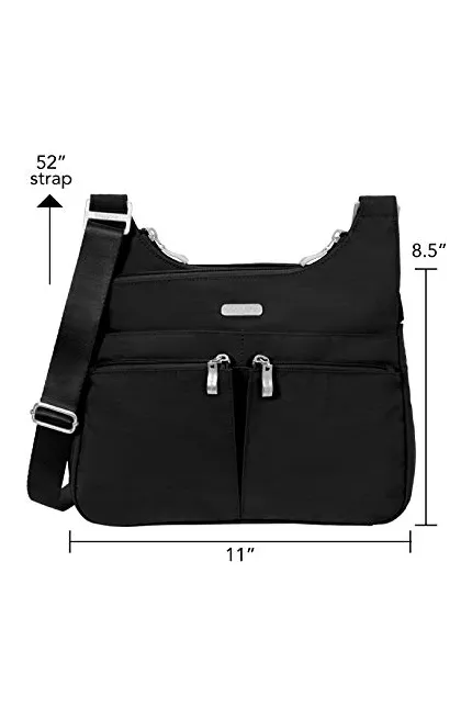 This is my second Baggallini bag and I choose this one since it was a little larger than my previous bag and has more compartments. Love the charcoal exterior color and the pink interior. The cross over fit is adjustable so I was able to get the length exactly right for my height. Similar to my other bag, this one seems very well made. Love the number and variable sizes of the different compartment. Love the design of the 2 large zipper sections with a center snap section. Glad that I have the 2 bag sizes to use depending on how many items I need to carry on a given day. I wish the matching charcoal/pink wallet wasn’t so pricey because it would be great to have.