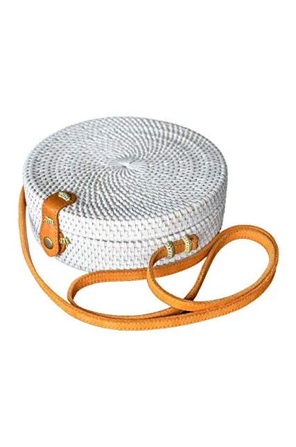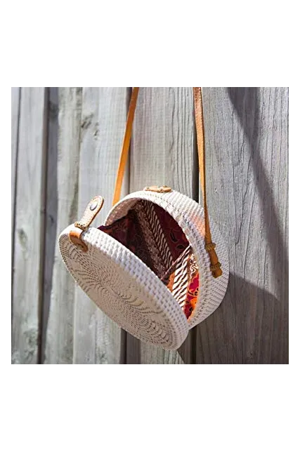 Bali Harvest Handwoven Round Woven Ata Rattan Bag Colorful Batik Linen Inside (with Genuine Leather Strap)