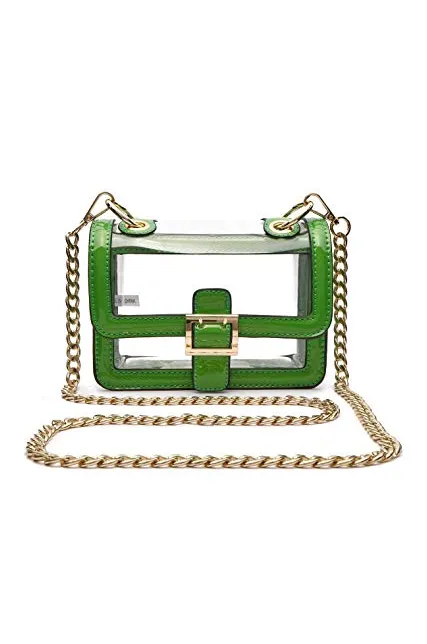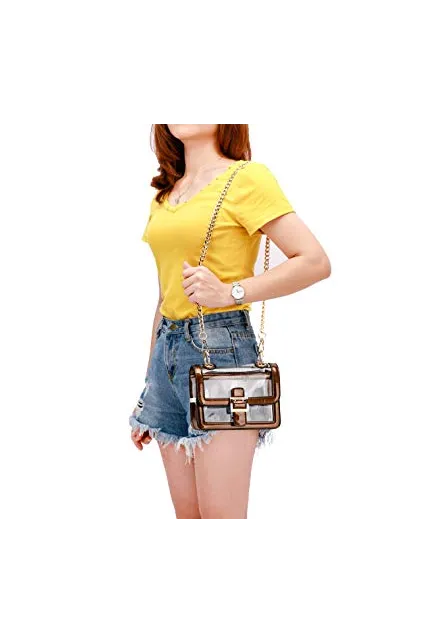 - ♦ MATERIAL: Made from Clear Plastic PVC with Faux Leather Trim and Gold Tone Chain Strap and Hardware