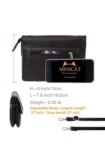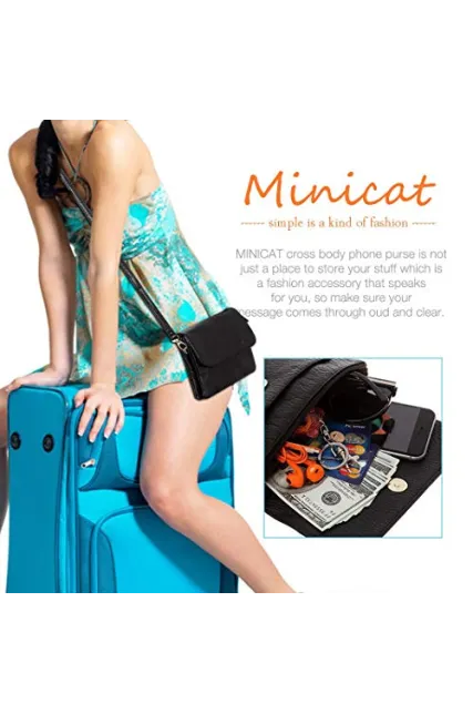 - Material and Dimension:MINICAT women small crossbody purse design with superior soft Synthetic leather with Lchee texture and GOLD color of hardware,which is durable and nice.Purse inside is in lined with MINICAT LOGO fabric material to avoid friction to the phone and causing any damage.(Dimension:Length 7.8in * Width 1.3in * Height 6in)