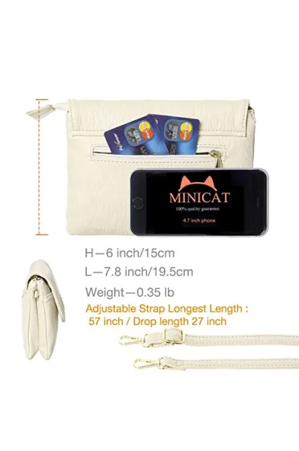 - Material and Dimension:MINICAT women small crossbody purse design with superior soft Synthetic leather with Lchee texture and GOLD color of hardware,which is durable and nice.Purse inside is in lined with MINICAT LOGO fabric material to avoid friction to the phone and causing any damage.(Dimension:Length 7.8in * Width 1.3in * Height 6in)