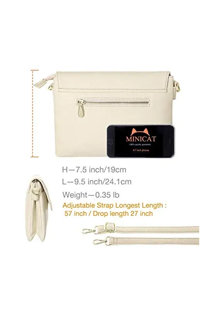 - Material and Dimension:MINICAT women small crossbody purse design with superior soft Synthetic leather with Lchee texture and GOLD color of hardware,which is durable and nice.Purse inside is in lined with MINICAT LOGO fabric material to avoid friction to the phone and causing any damage.(Dimension:Length 9.5in * Width 1.5in * Height 7.5in)