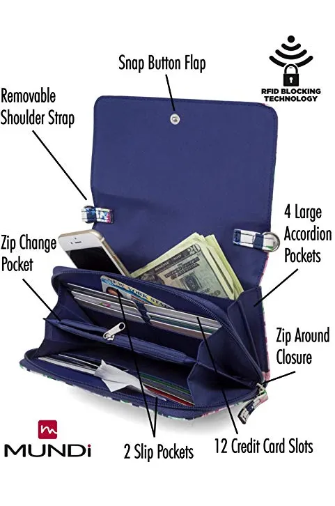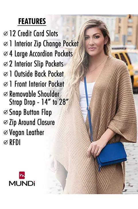 - MUNDI CROSSBODY PURSES FOR WOMEN - Each womens crossbody bag includes: 12 credit card slots, interior zipper coin and change pocket, 2 accordion pockets, 4 large pockets, outside pocket, zip around closure and snap button closing