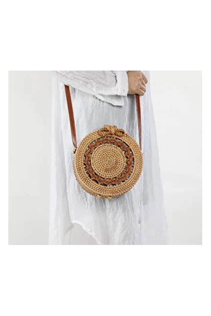 - The shoulder strap is made of PU leather. Rattan bag diameter: 7.87" (20 cm), Bag height: 3.15" (8 cm), length of Leather shoulder straps : 53 (135 cm)