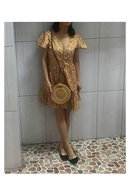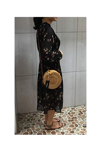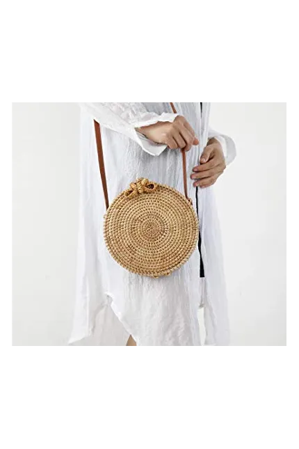 - The shoulder strap is made of PU leather. Rattan bag diameter: 7.9" (20 cm), Bag height: 3.15" (8 cm), length of Leather shoulder straps : 53" (135 cm)