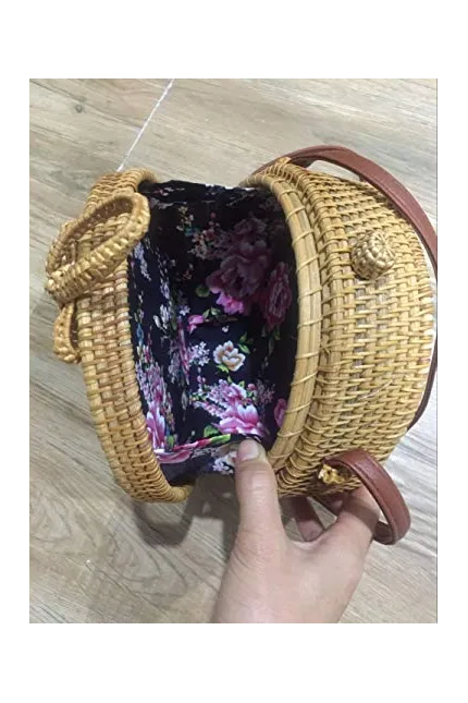 - Every round rattan bag is handmade, so it may vary slightly in detail and size due to the nature of this material. After woven, the bags are smoked over coconut husks to add durability and strength. The smokey scent is due to this making process, but will naturally disappear over time with using and exposure to air.