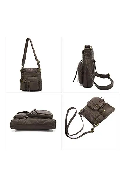 I bought this bag in the dark brown color "coffee" and I absolutely love it. I was torn between the black, dark brown, and light brown and many of the reviews only had photos of the light brown and black so I took a risk. Its gorgeous, sturdy, and the perfect size. It holds my 4.5x8 inch wallet easily with plenty of room for more things. Could easily hold a standard disposable water bottle. The strap is the perfect length.