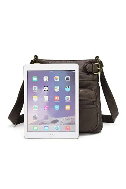 Ill get right down to the facts here, there are pros and cons to this bag. Pros: *The size is big enough to fit my 8.9" Kindle HDX in the main compartment. (Yay!) *The strap is a nice length with good adjustability. It is soft and comfortable. *The weight of the bag is Very light. This is nice, I do not like a heavy purse! *And last but not least, the compartments are nice. Here is a rundown on them: The small snap pocket on the front fits my cell phone (old flip style phone), and the pocket just beside it fits a variety of other things. I use it for my girly items...lipstick, nail clippers, mini mirror, gum, tooth picks, etc. It is great to have these smaller items all in one place. There are also four additional zipper compartments, the large zippers on both the outside front and back of the bag, the small zipper compartment on the front of the girly pocket, and an inside zipper compartment. The main inside compartment (also a zippered area), has two slip pockets, I use one for my sunglasses and the other for my metal wallet. These are bigger than the small cell pocket on the front of the bag, so they may be big enough for a smart phone. Now for the cons: *The lining....I got the black bag. I thought the lining might be like the one shown in the picture, but it is dark brown. It is surprising how difficult it is to see into the bag with that dark lining. *The shape of the bag is a bit more A shaped than what I expected from the photo. This means the opening to the main compartment is a little tighter than what I would consider to be ideal. *Softness....Generally a nice soft bag would be a good thing. And maybe to some extent it is, since it may be a factor in how lightweight the bag is. But the softness in this bag makes it very floppy. It is difficult to sit the bag on a surface and have it hold any sort of a shape while you rummage through it. Sometimes the top section with the buckles, almost falls down into the bag itself. After considering all the pros and cons, I almost returned it. The thing that made me keep it, is the fact that its a lightweight way to carry my Kindle, along with all my other purse items, without having to carry a second bag, or a bigger bag. I will use it for those occasions when I have an overnight stay somewhere and want to bring my Kindle along. In case anyone has a different size tablet they are wondering about, my Kindle (with folding cover) measures 6 1/4" wide by 9" tall, and its about 5/8" thick. The 6 1/4" width is just about right to get it into the opening with maybe a half inch to spare on either side. The height is just about at its limit. You may get by with a device that measures another 1/2", but not much more. I generally like a small minimalistic purse that provides organization. This purse is actually a bit bigger than what I usually like, but since it has become my Kindle bag, the size is a good thing. Bottom line, although this bag does not measure up to the hopes I had for it, I still find purpose for it. I am keeping it and I will use it. If I suddenly found myself without it though, I probably wouldnt buy it again. Three stars means "its okay", and that describes my thoughts about this bag pretty accurately... so three stars it is!