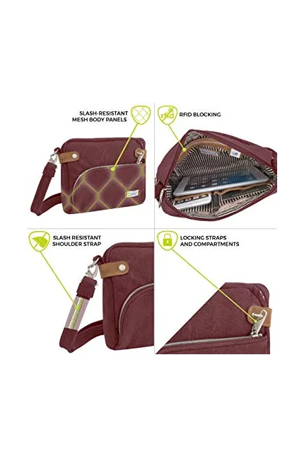 Make sure this fitsby entering your model number. Roomy compartment with zippered RFID blocking pocket PATENT: http://www.travelonbags.com/patent-marking 2 open top wall pockets and a tethered key clip with LED light Easy access, locking front zippered pocket Rear zippered pocket Size: 9.75" x 7.75" x 2.5" Strap Drop Length: 13" – 25"