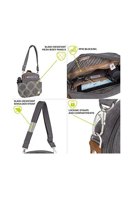 I had been dragging this around on a 2-week trip to Europe, where I was likely to frequent many pickpocket-rich areas. I did not get pick-pocketed, but I was also very wary, mostly carried the bag slung across my body with the bag to the front, and did not engage anyone starting a conversation with,"do you speak English?" or "are you from America?" After the latch on a frontal pocket broke, I reorganized my bag to keep trash and other undesirables in that pouch in case anyone tried picking my purse. Overall, it was a good travel bag, but can use some improvement. Pros: Lots of compartments, the side pockets on the side were great for carrying a small umbrella (it rained almost every day), mostly sturdy construction. It carries the weight well, save a slight problem described below. It is large enough to carry an iPad, my sketchbook (about the size of the iPad), and several other smaller items. (I am notoriously guilty of carrying everything but the kitchen sink) The somewhat hidden pocket on the back of the bag is perfect for carrying a passport and other high value items that do not need to be accessed regularly. Cons: The front pockets cannot be filled too much without interfering with the main compartment. Within 3 days of using it, the metal latch intended to secure one of the front compartments broke, I will reach out to Travelon to see if it can be repaired. Lastly, the strap can be extended/shortened, but the metal piece and bands of cloth can be very uncomfortable to the shoulder/back depending on where it falls. EDIT: Travelon is unable to repair the bag, but will honor the warranty and send a new bag if I send photos showing that I destroyed the bag with a knife/scissors and rendered it unusable. This strikes me as exceedingly wasteful, so I will just fix this myself.