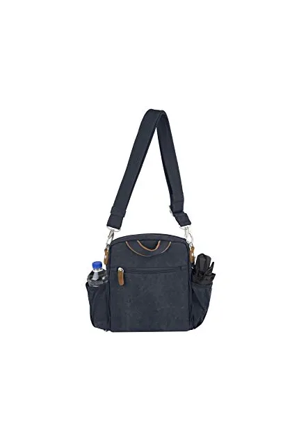 Make sure this fitsby entering your model number. Roomy compartment withzippered RFID blocking pocket,padded pocket to hold an iPador tablet, and tethered key clipwith LED light Two easy access, locking front pockets Two mesh expansion pockets hold a water bottle, umbrella or sunglasses. Rear zippered pocket. hold a water bottle, umbrella or sunglasses Material: Cotton Polyester Blend. Size: 9" x 11.5" x 3". Strap Drop Length: 14" – 25"