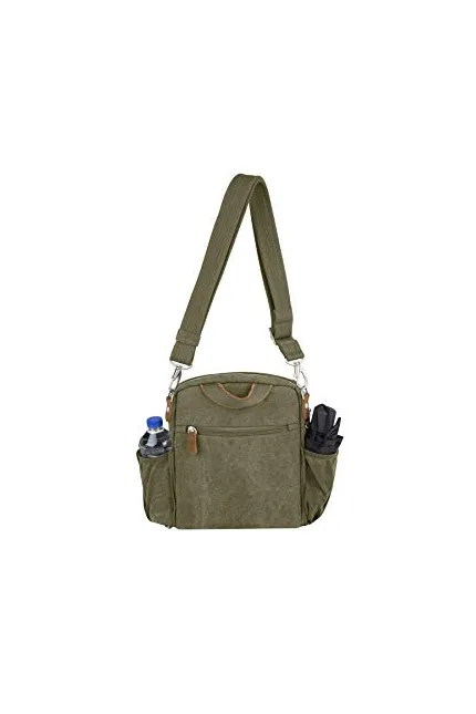 Make sure this fitsby entering your model number. Roomy compartment withzippered RFID blocking pocket,padded pocket to hold an iPador tablet, and tethered key clipwith LED light Two easy access, locking front pockets Two mesh expansion pockets hold a water bottle, umbrella or sunglasses. Rear zippered pocket. hold a water bottle, umbrella or sunglasses Material: Cotton Polyester Blend. Size: 9" x 11.5" x 3". Strap Drop Length: 14" – 25"