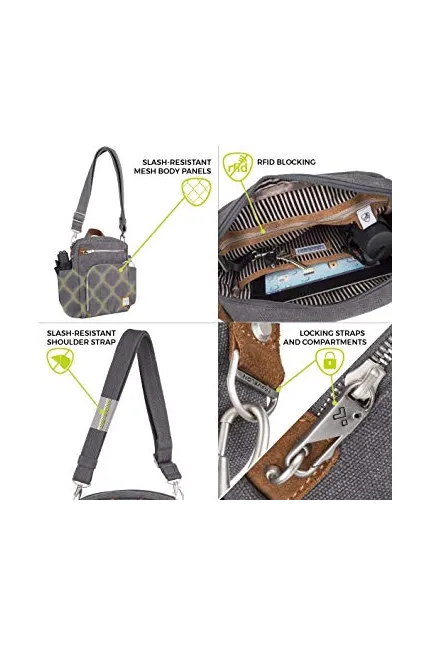 I had been dragging this around on a 2-week trip to Europe, where I was likely to frequent many pickpocket-rich areas. I did not get pick-pocketed, but I was also very wary, mostly carried the bag slung across my body with the bag to the front, and did not engage anyone starting a conversation with,"do you speak English?" or "are you from America?" After the latch on a frontal pocket broke, I reorganized my bag to keep trash and other undesirables in that pouch in case anyone tried picking my purse. Overall, it was a good travel bag, but can use some improvement. Pros: Lots of compartments, the side pockets on the side were great for carrying a small umbrella (it rained almost every day), mostly sturdy construction. It carries the weight well, save a slight problem described below. It is large enough to carry an iPad, my sketchbook (about the size of the iPad), and several other smaller items. (I am notoriously guilty of carrying everything but the kitchen sink) The somewhat hidden pocket on the back of the bag is perfect for carrying a passport and other high value items that do not need to be accessed regularly. Cons: The front pockets cannot be filled too much without interfering with the main compartment. Within 3 days of using it, the metal latch intended to secure one of the front compartments broke, I will reach out to Travelon to see if it can be repaired. Lastly, the strap can be extended/shortened, but the metal piece and bands of cloth can be very uncomfortable to the shoulder/back depending on where it falls. EDIT: Travelon is unable to repair the bag, but will honor the warranty and send a new bag if I send photos showing that I destroyed the bag with a knife/scissors and rendered it unusable. This strikes me as exceedingly wasteful, so I will just fix this myself.