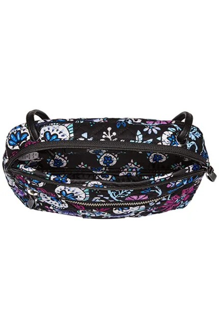 - CREDIT CARDS UNDER COVER: The Vera Bradley Iconic RFID Little Crossbody is made from a lightweight quilted cotton and faux leather trim that provides RFID technology to protect your credit cards and debit cards with a top zip closure