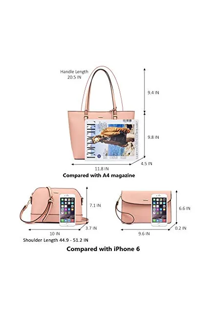 - 【DIMENSION】Top Handle Tote Bag: 11.8"x4.5"x9.8"(LxWxH), Handle Height: 9.4" , Handle Length: 20.5" . Medium Messenger Handbag: 10"x3.7"x7.1"(LxWxH), Shoulder Length: 44.9"-51.2". Wallet Clutch Purse : 9.6"x6.6"(LxH). Bag set Weight: 2.5lb, Tote weight: 1.3lb, crossbody bag weight: 0.75lb, wallet clutch weight: 0.42lb