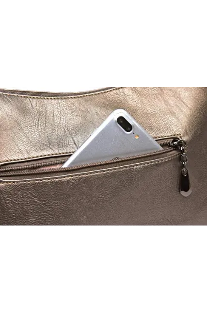 - Top zipper closure. Opens to 2 main compartments, 1 middle zippered pocket, 2 side open slots and 1 small zippered pocket. It also has 1 oblique front zippered pocket and 1 back zippered pocket for small items, not for large size phone.
