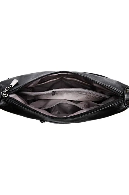 - Top zipper closure. Opens to 2 main compartments, 1 middle zippered pocket, 2 side open slots and 1 small zippered pocket. It also has 1 oblique front zippered pocket and 1 back zippered pocket for small items, not for large size phone.