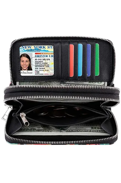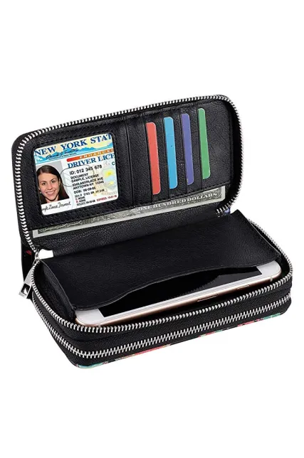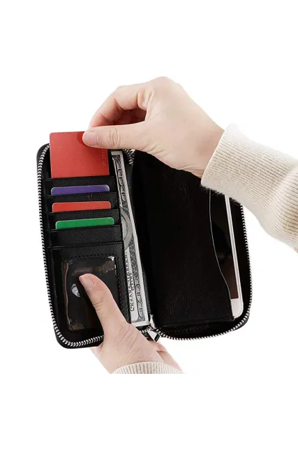 - Function Pockets: 5 card slots(including 1 clear ID windows), 2 full-length bill compartments,1 zippered coin pocket,1cellphone slot; keep your credit cards, cash, coins, notes, receipts, cheekbook and your cell phone well organized.
