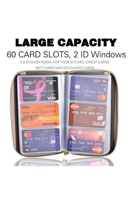 - Large Capacity: The card holder has 60 cards slots and 2 ID Windows. It is enough room for your ID card, credit cards, gift cards and dicounted cards. Small size is perfect to fit in your pockets or handbags.