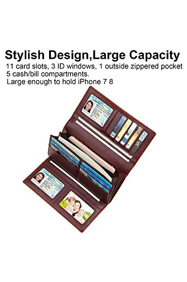 - FUNCTIONAL DESIGN - 11 credit card slots, 3 clear slots for ID/Driver License/Picture, 5 full-length cash/bill/checkbook compartments, 1 outside zippered pocket for change.Fit for iPhone X XS 7 8 Plus. Wallet Size: 7.6*3.7*0.8 inch.