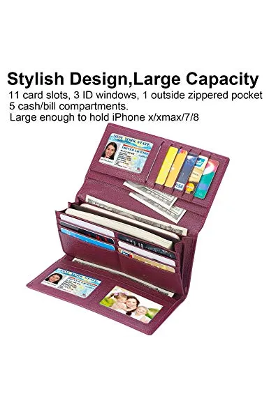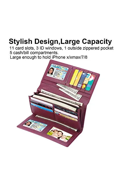 - FUNCTIONAL DESIGN - 11 credit card slots, 3 clear slots for ID/Driver License/Picture, 5 full-length cash/bill/checkbook compartments, 1 outside zippered pocket for change.Fit for iPhone X XS 7 8 Plus. Wallet Size: 7.6*3.7*0.8 inch.