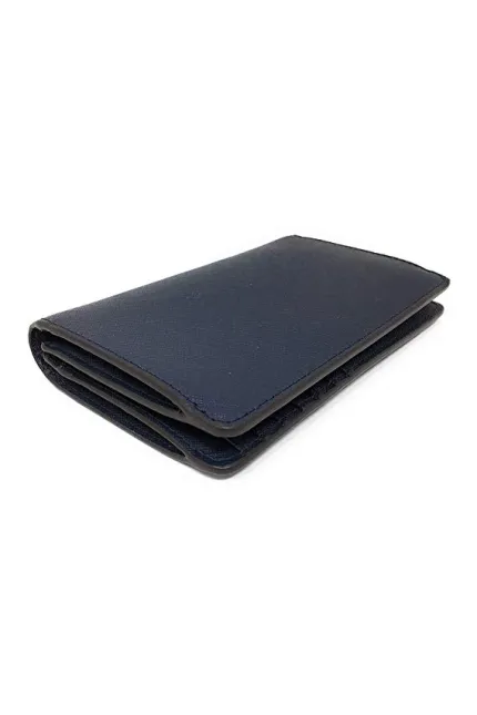 - Slim profile saffiano finished leather bifold wallet with polished golden tone hardware accents