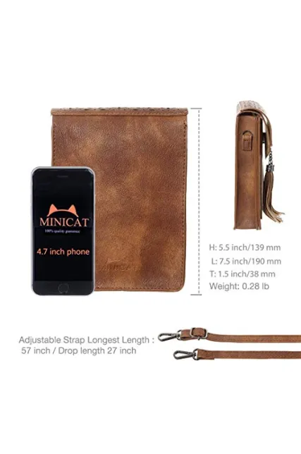 - ECO-Friendly: MINICAT Crossbody cell phone purse design with superior synthetic leather(have not any smell), which is ECO-Friendly, durable and soft. Purse inside is inlined with fuzzy material to avoid friction to the phone and causing any damage.(Dimension:Length 5.5in * Width 1.5in * Height 7.5in)