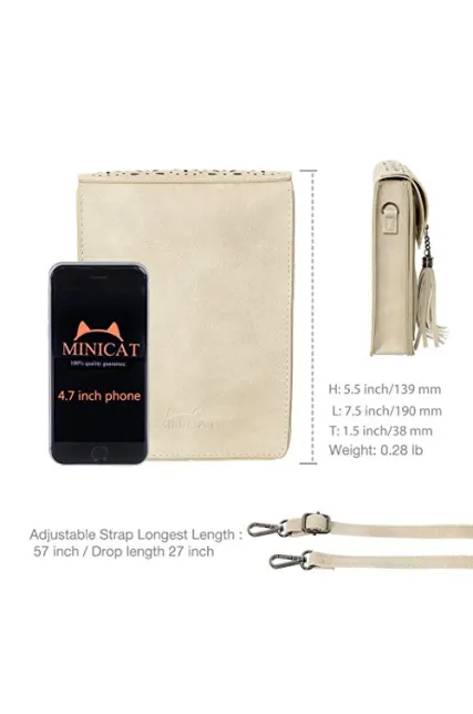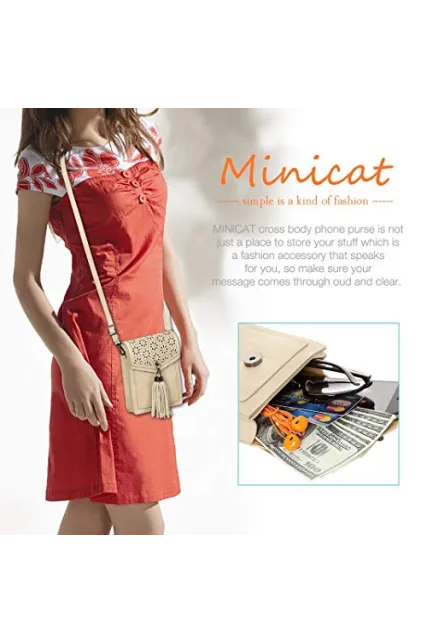 - ECO-Friendly: MINICAT Crossbody cell phone purse design with superior synthetic leather(have not any smell), which is ECO-Friendly, durable and soft. Purse inside is inlined with fuzzy material to avoid friction to the phone and causing any damage.(Dimension:Length 5.5in * Width 1.5in * Height 7.5in)