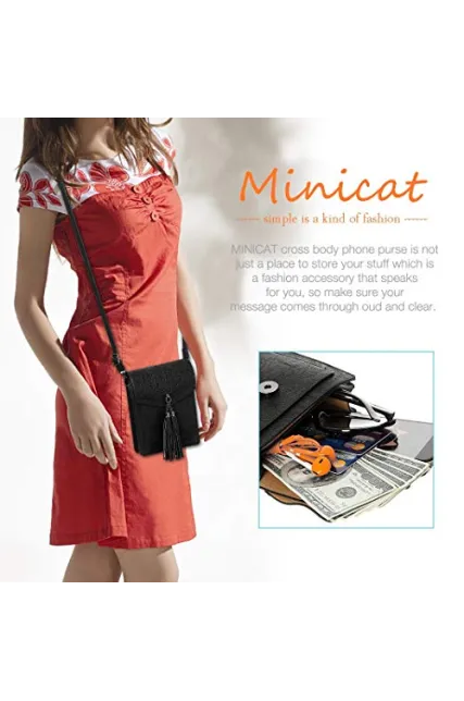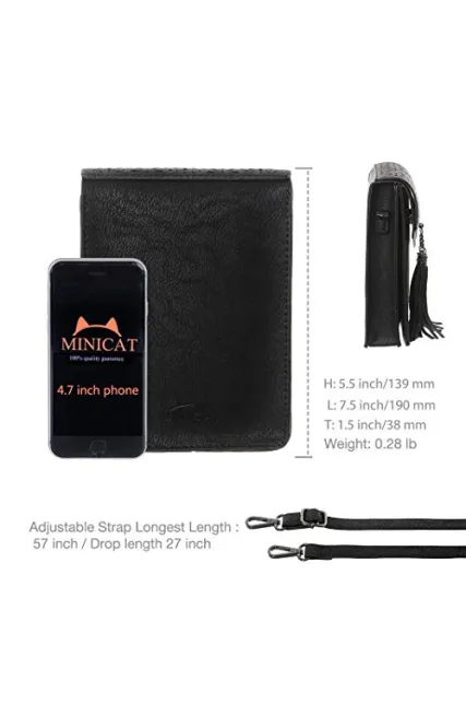 - ECO-Friendly: MINICAT Crossbody cell phone purse design with superior synthetic leather(have not any smell), which is ECO-Friendly, durable and soft. Purse inside is inlined with fuzzy material to avoid friction to the phone and causing any damage.(Dimension:Length 5.5in * Width 1.5in * Height 7.5in)